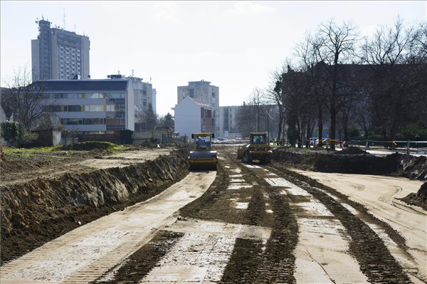 A kivitelezés második ütemének munkálatai zajlanak az új nyugati kiskörút építése során Debrecenben 2015. március 6-án. A 2 milliárd 141 millió forintos beruházás során az 530 méter hosszú körúton négy jelzőlámpás csomópontot építenek, valamint a környező utcákat is újraaszfaltozza a kivitelező Duna Aszfalt Kft.