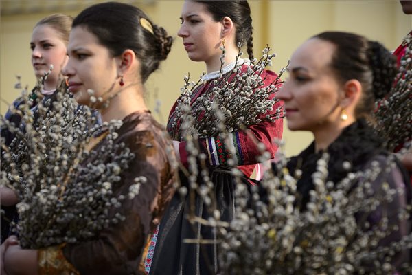 Hagyományőrzők barkát tartanak kezükben a virágvasárnapi barkaszentelési ünnepségen a debreceni református nagytemplom emlékkertjében 2015. március 29-én. MTI Fotó: Czeglédi Zsolt