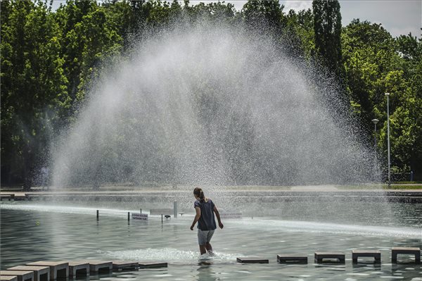 Szökőkút vízében hűsíti magát egy fiatal lány Debrecenben 2015. június 11-én. A hőség miatt június 12-re az Országos Meteorológiai Szolgálat figyelmeztetést adott ki tíz megyére és a fővárosra. Az országos tisztifőorvos a mai naptól 15-én éjfélig másodfokú hőségriasztást rendelt el. MTI Fotó: Czeglédi Zsolt