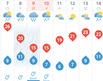 Pénteken már többfelé várható zápor, elszórtan zivatar. A Dunántúlon a szél erős, néhol viharos lesz, keleten legfeljebb helyenként erősödik meg a légmozgás. A leghidegebb órákban 9-15 fok lehet. Nappal 14-26 fokig melegszik a levegő, a Nyugat-Dunántúlon lesz a hűvösebb, a Tiszántúlon pedig a melegebb.