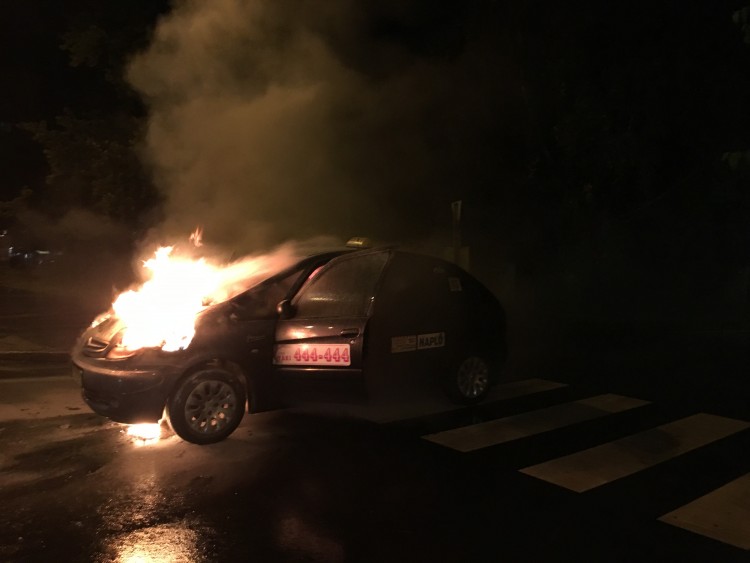 Taxi gyulladt ki menet közben hétfő este az Egyetem sugárút és a Poroszlay utca sarkán. A helyszínre érkező tűzoltók eloltották a lángoló járművet, szerencsére senki nem sérült meg.
