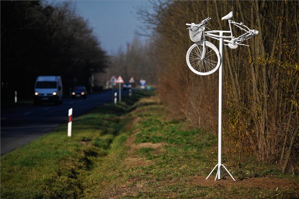 Egy korábbi gázolás során összetört kerékpár fehérre festett roncsa a Debrecen és Létavértes közötti út mellett 2016. november 22-én. A kerékpárroncsot a Debreceni Rendőrkapitányság állította ki figyelemfelkeltés céljából. MTI Fotó: Czeglédi Zsolt