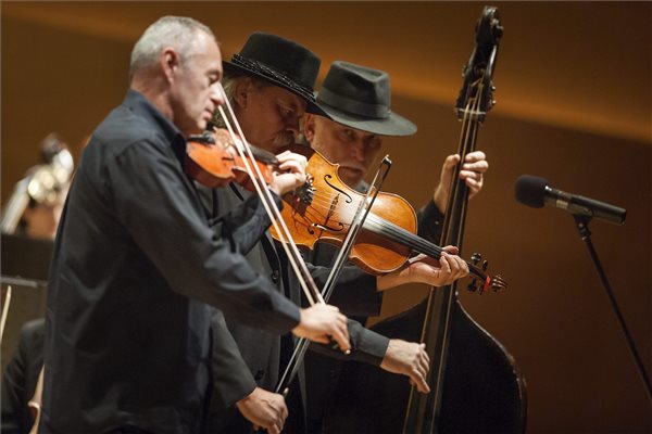 Porteleki László, Éri Péter és Hamar Dániel (b-j) a Muzsikás együttes és a debreceni Kodály Filharmonikusok Csak tiszta forrásból című közös koncertjén a debreceni Kölcsey Központban 2015. november 24-én. MTI Fotó: Czeglédi Zsolt