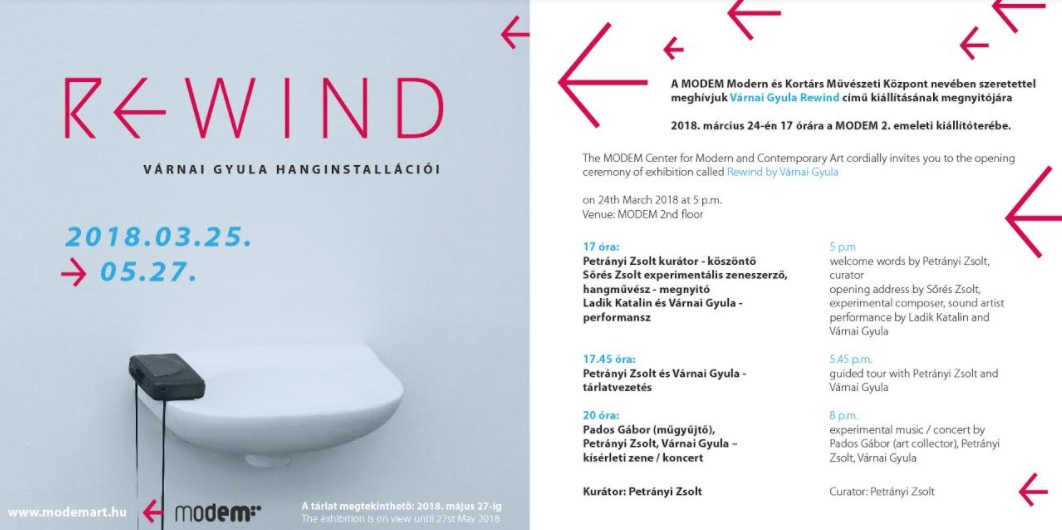 Rewind címmel Várnai Gyula hanginstallációiból nyílik nagyszabású tárlat a MODEM-ben, több mint ezer négyzetméternyi kiállítótérben. A 2017-es velencei biennálé magyar pavilonjának kiállítója nemcsak korábbi munkáival, de új alkotásokkal is készül a debreceni bemutatkozásra, sőt a tárlat nyitvatartási ideje során több alkalommal maga is fellép zenészként. A kiállítás kurátora Petrányi Zsolt.