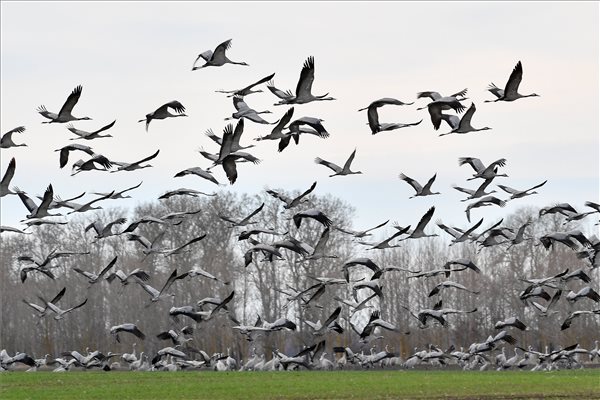 Észak-Afrikából Észak-Európába tartó szürke darvak (Grus grus) egy csoportja a Borsod-Abaúj-Zemplén megyei Nagyhomok határában 2019. március 11-én.