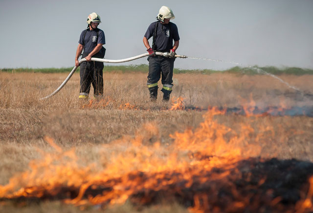 A megyei műveleti szolgálat irányításával hét vízsugárral valamint kéziszerszámokkal megkezdték a lángok eloltását. Az oltási munkálatokat nagyban nehezíti a magas hőmérséklet és a váltakozó irányú szél is – mondta a szóvivő.