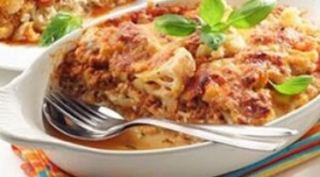 4. Az előzőleg megpárolt rizst öntsük egy hőálló tálba, tegyük rá a karfiolokat és a húsos szószt. Végezetül reszeljünk rá sajtot és tegyük sütőbe 20 percre.