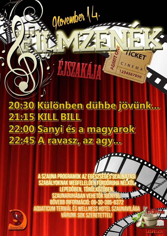 Mennyei illatokkal, kellemes filmzenékkel, kényeztető bőrápoló programokkal, popcorn-nal, sós mogyoróval és gyümölcstállal várja vendégeit az Aquaticum Szauna Klubja. Időpont: 2014. november 14. péntek.
