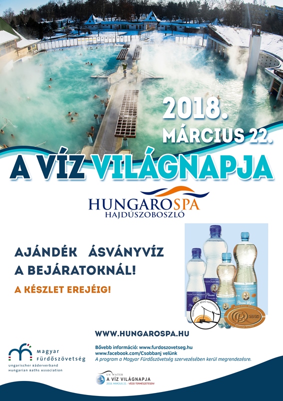 2018. március 22-én ünnepeljük a Víz Világnapját. A Hungarospa Hajdúszoboszlói Zrt. is csatlakozott az eseményhez. Ezen a napon ajándék ásványvízzel várják a Gyógyfürdő, az Aqua-Palace Élményfürdő és az Árpád uszoda vendégeit.