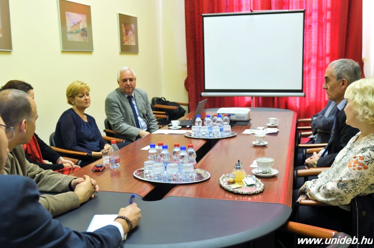 A konzorcium tagjai közül a turkui és a valenciai egyetem képviselői látogattak csütörtökön a Debreceni Egyetemre. Anu Härkönent, a Turkui Alkalmazott Tudományok Egyeteme külügyi vezetőjét, valamint a Valenciai Politechnikai Egyetemről Juan Miguel Martinez-Rubio kabinetfőnököt és Javier Orozco-Messana külügyi igazgatót Bartha Elek oktatási rektorhelyettes köszöntötte, aki röviden ismertette a Debreceni Egyetem képzési spektrumát és tudományos tevékenységét, kiemelve az intézmény angol nyelvű képzéseit. A delegáció tagjai kifejezetten érdeklődtek az egyetem nemzetközi kapcsolatai, kutatási programjai, valamint a külföldi partnerek közös képzései iránt.
