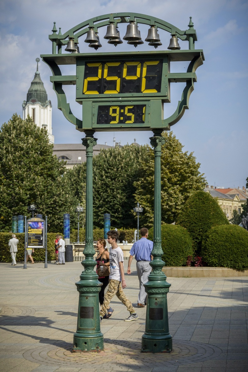 Debrecen, 2014. szeptember 1. 25 Celsius-fok mutat a hőmérő a debreceni Kossuth téren 2014. szeptember 1-én.