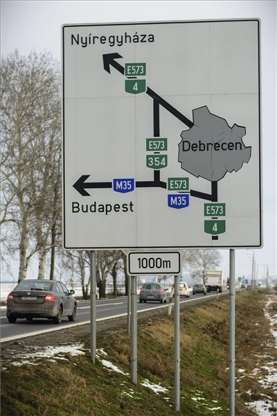 Közúti jelzőtábla a 4-es főúton Debrecen határában 2015. január 8-án. A 354-es számú főút – amely a 4-es főút várost elkerülő szakasza – néhány kilométeren keresztül az M35-ös autópályán halad, így ez a szakasz egy része is útdíjkötelessé vált. MTI, fotó: Czeglédi Zsolt