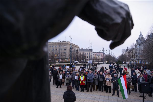 Résztvevők a Százezren az internetadó ellen, valamint a 60 ezren a Magánnyugdíjukért Facebook-csoport Tavasz jön – Orbán megy! elnevezésű tüntetésen a debreceni Kossuth téren 2015. február 1-jén. MTI, fotó: Czeglédi Zsolt