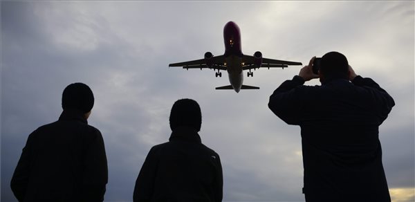 Érdeklődők nézik, ahogy landoláshoz készül egy repülőgép a debreceni repülőtéren 2015. február 22-én. MTI Fotó: Czeglédi Zsolt