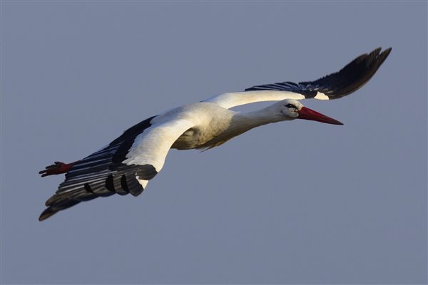 A visszatért fehér gólyák egyike (Ciconia ciconia) Görbeháza közelében 2015. március 10-én. A helybéliek az elmúlt napokban vették észre, hogy visszatértek a madarak. MTI, fotó: Czeglédi Zsolt