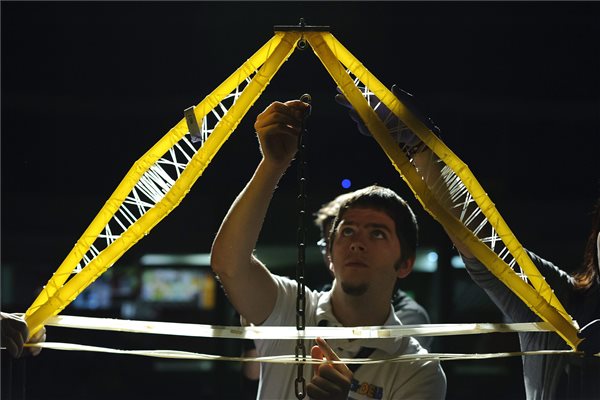 A Debreceni Egyetem Műszaki Kar NO.1 nevű csapatának tésztahídjára helyez súlyt egy közreműködő az egyetem műszaki karának építőmérnöki tanszéke által rendezett TörDElő tésztahíd-építő versenyen a debreceni Lovarda Egyetemi Kulturális és Konferenciaközpontban 2015. november 9-én. MTI Fotó: Czeglédi Zsolt