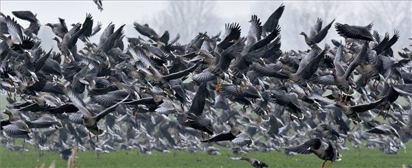 Nagy lilikek (Anser albifrons) Hortobágy térségében 2015. december 4-én. Magyarországon az egyik legnagyobb számban előforduló vadlúdfaj, amelynek több tízezres populációja október és március között rendszeres vendége a hortobágyi pusztáknak és halastavaknak. MTI Fotó: Czeglédi Zsolt