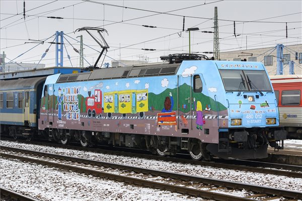A MÁV-csoport Ha nagy leszek, vasutas leszek! című gyermekrajzpályázatának győztes alkotásaival díszített TRAXX típusú mozdony a debreceni vasútállomáson 2016. január 25-én. A pályázatot holtversenyben megnyerő 9 éves, budapesti Haidekker Zsófia, illetve a 12 éves, zagyvarékasi Farkas András rajzai alapján készült grafikákkal díszített mozdony menetrend szerint közlekedik az ország több vonalán. MTI Fotó: Czeglédi Zsolt
