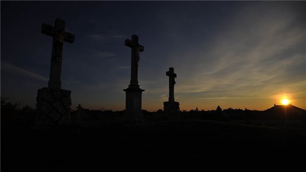 Feszületek a kálváriadombon naplementekor az egyeki lezárt kálváriatemetőben a közelgő mindenszentek ünnepe és halottak napja előtt (felső kép).