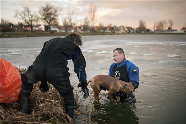 Madarász Lajos, a Kelet-magyarországi Speciális Mentő Egyesület tagja és Vincellér Tibor, az egyesület elnöke kiemeli egy jég alá csúszott staffordshire terrier tetemét a nyíregyházi Bujtosi-tóból.Az egyesület három munkatársa közel nyolcórás kutatás után talált a már megfagyott ebre.