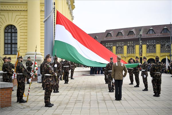 Katonai tiszteletadással felvonják Magyarország lobogóját az 1848-49-es forradalom és szabadságharc 170. évfordulója alkalmából rendezett ünnepség előtt a debreceni Kossuth téren 2018. március 15-én. Fotó: Czeglédi Zsolt / MTI
