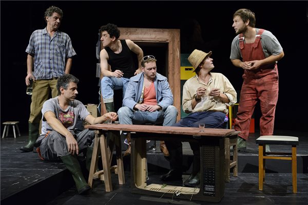 Bakota Árpád (b) Terhes Mihály, Vranyecz Artúr (b2) Béres szomszéd, Mercs János (b3) Szerémi Lajos, Papp István (b4) Aladár, Pál Hunor (b5) Végső Márton és Kiss Gergely Máté (b6) Koczkás Oszi szerepében Mészáros Tibor Istent a falra festeni című drámájának próbáján a debreceni Csokonai Nemzeti Színház Víg Kamaraszínházában 2014. szeptember 22-én.