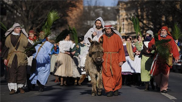 Jézus jeruzsálemi bevonulását megjelenítő virágvasárnapi menet a debreceni Csapó utcában 2016. március 20-án. MTI Fotó: Czeglédi Zsolt