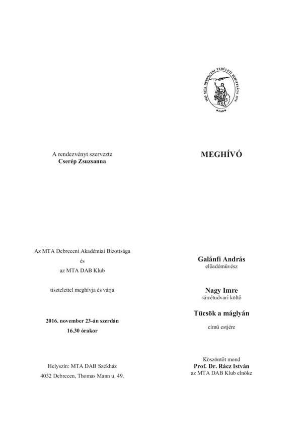 Tücsök a máglyán – Galánfi András estje a DAB székházban Kultúra november 16, 2016Szabolcs SzilágyiSzóljon hozzá a Tücsök a máglyán – Galánfi András estje a DAB székházban bejegyzéshez Közreműködik: Nagy Imre, sárrétudvari költő.