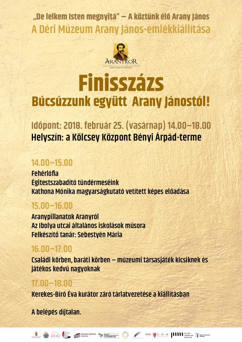 Végéhez ér február 28-án DE LELKEM ISTEN MEGNYITÁ– A KÖZTÜNK ÉLŐ ARANY JÁNOS címmel a Déri Múzeum emlékkiállítása.A finisszázs február 25-én, 14 órától 18 óráig tart majd, a Kölcsey Központ Bényi Árpád-termében.