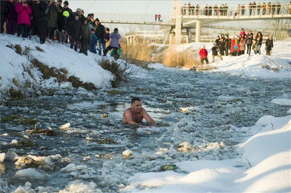 Schirilla György a Zagyva folyóban a Heves jeges életmód-találkozón Hatvanban 2017. január 15-én. MTI Fotó: Komka Péter