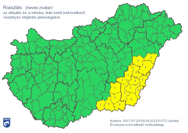 A meteorológiai szolgálat felhőszakadás és heves zivatar miatt elsőfokú riasztást adott ki a déli és délkeleti határ menti járásokra, itt kis valószínűséggel a bőséges csapadék mellé károkozó szél és/vagy jég is társulhat.