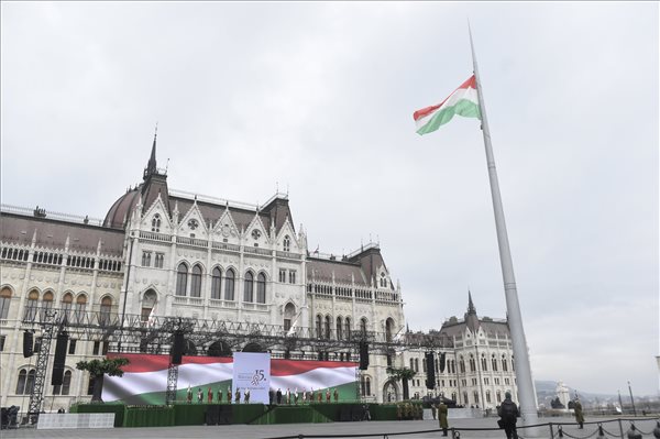 Katonai tiszteletadás mellett felvonták a nemzeti lobogót a március 15-ei nemzeti ünnepen, csütörtök délelőtt az Országház előtt.