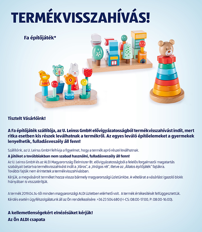 Az Aldi Magyarország és beszállítója, az U. Leinss GmbH azonnal visszahívja a Fa építőjáték termék “Város”, “Virágos rét”, illetve “Állatos építőjáték” fajtáit, mivel ezekről a játékokról ritka esetben kis részek leválhatnak, amit a gyermek lenyelhet – közölte az Aldi pénteken az MTI-vel.