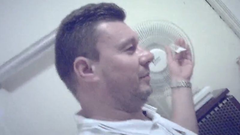 fehér port tartalmazó zacskót tart egy ventilátor elé, hogy kiszárítsa az anyagot, amelyet később egy tányéron kezd el kiporciózni bankkártyája segítségével.