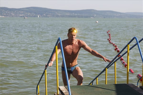 Papp Márk debreceni úszó, a Révfülöpről indult Balaton-átúszás győztese beérkezik a célba Balatonbogláron 2015. július 4-én. MTI Fotó: Varga György