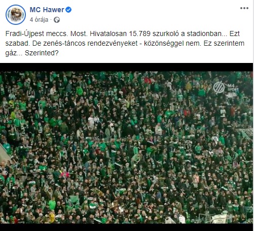 Fradi-Újpest meccs. Most. Hivatalosan 15.789 szurkoló a stadionban… Ezt szabad. De zenés-táncos rendezvényeket – közönséggel nem. Ez szerintem gáz… Szerinted?